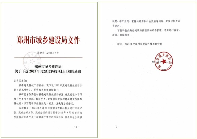 1月16日,郑州市城乡建设局印发了“关于下达2025年度建设科技项目计划的通知”,AG在线(中国)唯一官方网站申报的2项成果“装配整体式建筑施工电梯附墙结构技术研究”和“基于BIM技术的数字化审图方法研究”,经专家评审,获得郑州市2025年度建设科技项目计划立项。